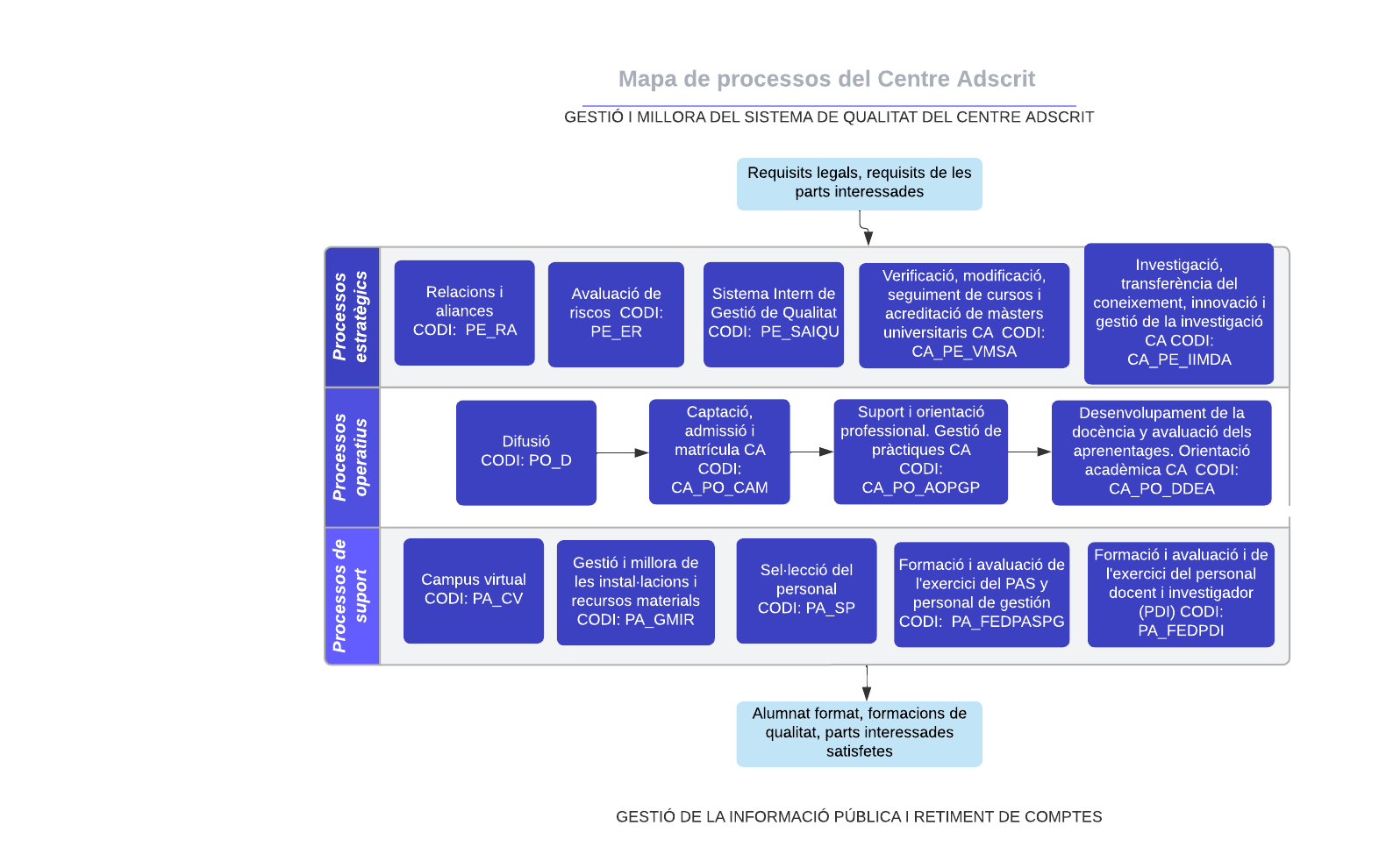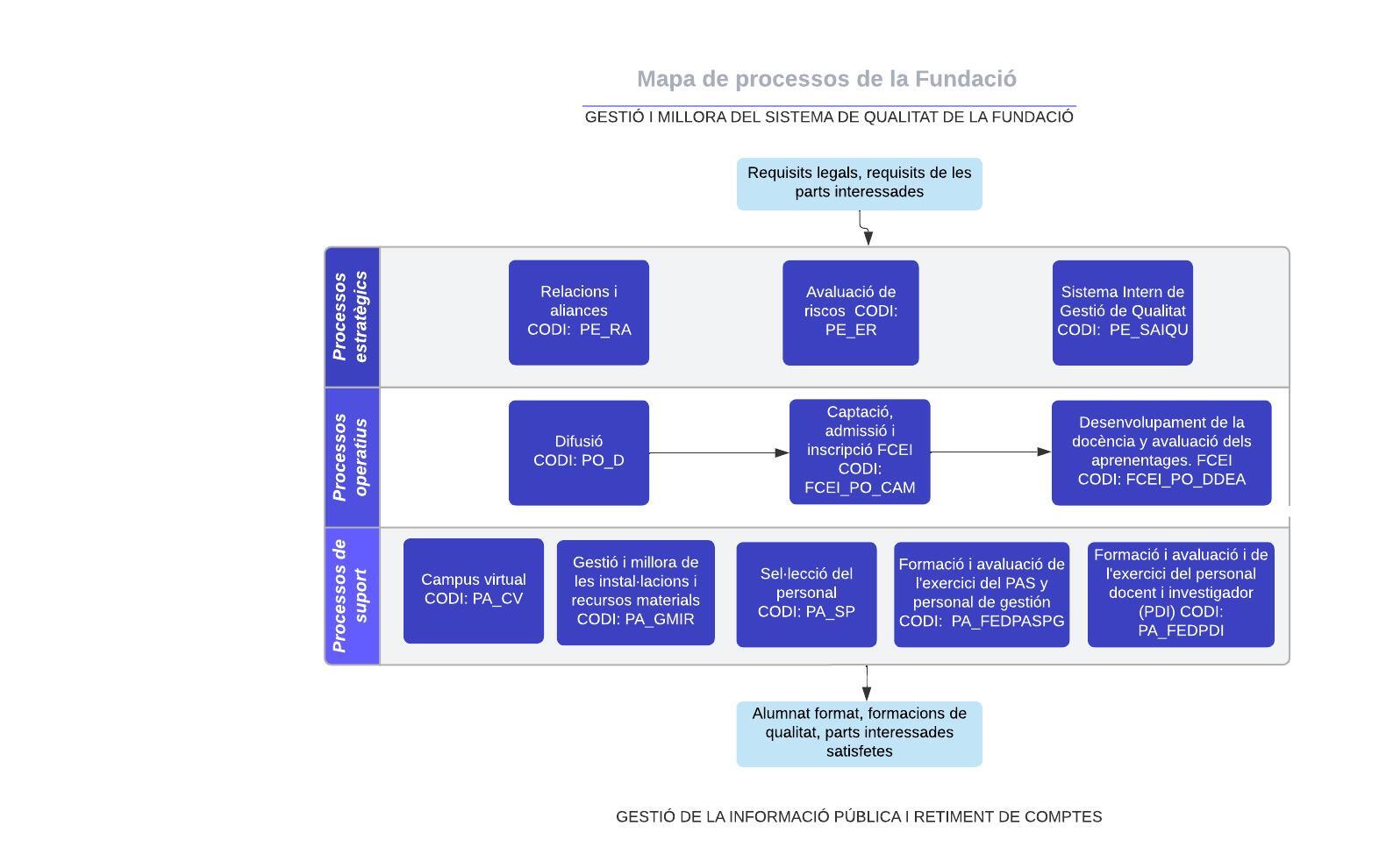 A partir d’aquí, l’organització desenvolupa els processos tot identificant les entrades i sortides, guies i suports de cadascun dels processos operatius del mapa global de processos. També es descriuen les activitats que formen part dels processos, així com els responsables de dur-les a terme en un procés de millora continuada. (Aprovació el 24 de febrer de 2022).