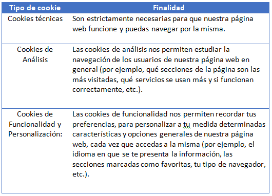 A continuació, procedim a informar-te sobre tots els tipus de cookies que actualment s’utilitzen a la nostra pàgina web i la finalitat de cadascuna de les mateixes: